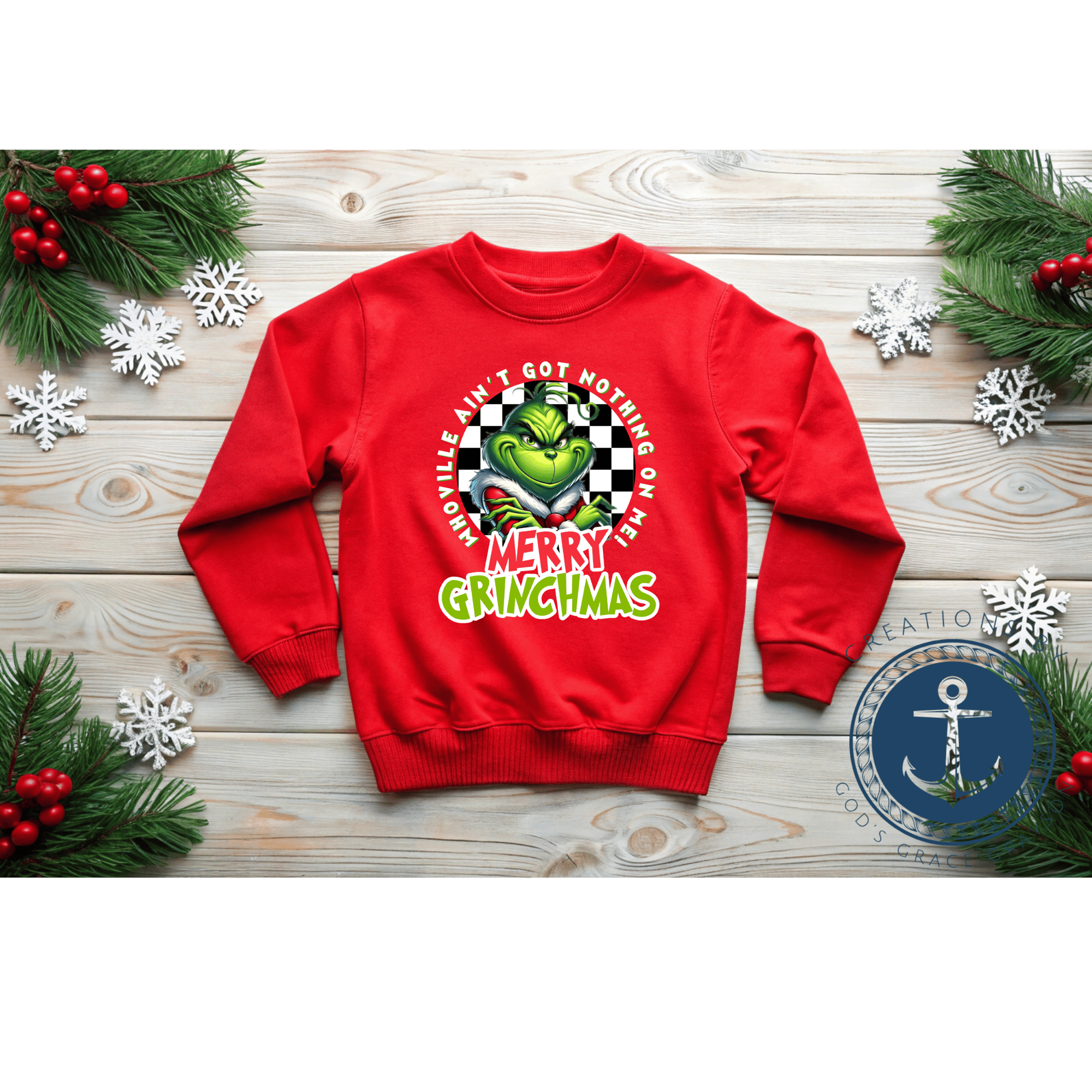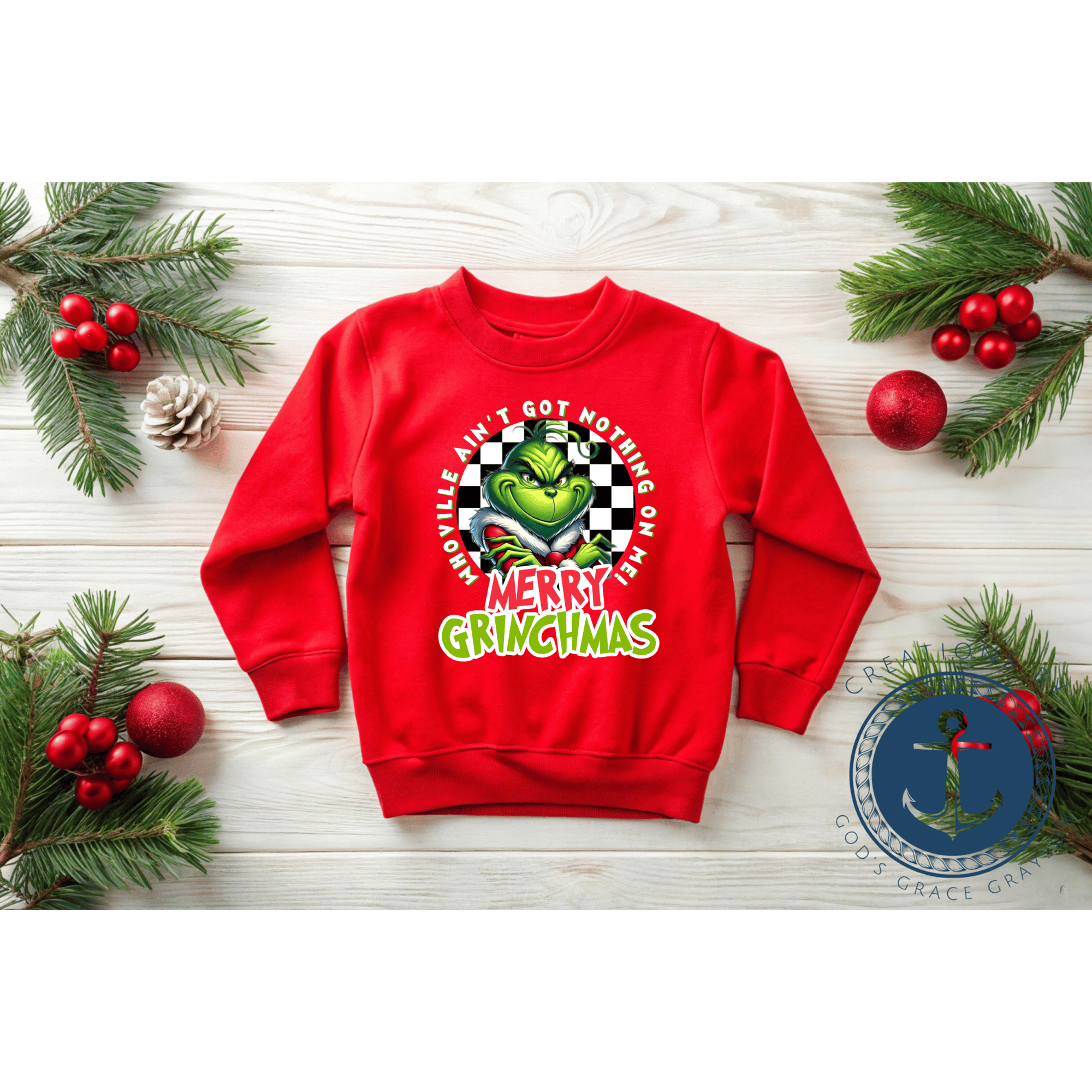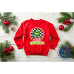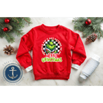 - Cozy red kids Christmas sweatshirt with “Merry Grinchmas” statement graphic